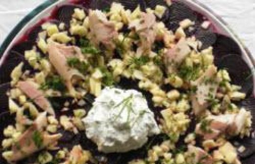 Portionen : 4 5 rote Bete Salz 2 Äpfel, geschält, Kerngehäuse entfernt und fein gewürfelt 3 Schalotten, fein gewürfelt 125 ml Apfelsaft 125 ml Gemüsebrühe 125 ml geschmacksneutrales Öl etwas Weißweinessig schwarzer Pfeffer aus der Mühle 3 geräucherte For [...]