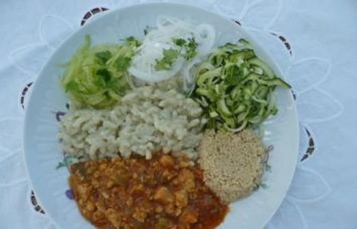zutaten_2sp"> Zutaten für Personen Bild einstellen 40 Gramm Zucchini, Gurke und Rübchen 60 Gramm Tempeh 1 Stk. Frühlingszwiebel frisch, geschnitten 1 EL Öl 20 Gramm Cuscus 50 Gramm Pasta 1 EL Tomatenmark [...]