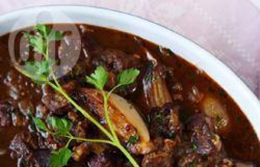 Portionen : 6 1,5 kg Rinderschmorbraten, in Würfeln 1,5 TL Salz 1 TL Pfeffer 125 g Speck, gewürfelt 2 Zwiebeln 3 Knoblauchzehen, gehackt 3 EL Mehl 350 ml Burgunder 350 ml Hühnerbrühe 2 Lorbeerblätter 1 TL Thymian 100 g Schalotten fein gehack [...]