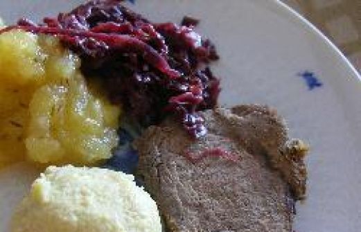 Portionen : 6 Marinade: 1 kg Rinderschmorbraten 225 ml trockener Rotwein 225 ml Rotweinessig 1 Lorbeerblatt 2 ganze Nelken ½ TL zerstoßene Pfefferkörner ½ TL zerstoßene Wacholderbeeren Braten: Salz frisch gemahlener schwarzer Pfeffer 15 g Butterschmalz [...]