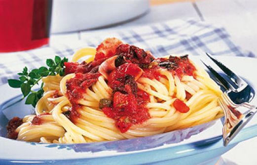 Spaghetti in Tomaten-Sardellen-Sauce Zutaten 3 Knoblauchzehen 8-10 Sardellenfilets (aus dem Glas) 150 g schwarze Oliven 1-2 EL Kapern 500 g reife Fleischtomaten 6-8 EL Olivenöl Salz 1 Msp. Cayennepfeffer 500 g Spaghetti guk:similarity-keywords=""> 3 Knoblauchzehen , [...]