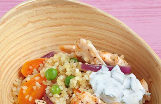 Bulgur-Hähnchen-Pfanne Zutaten 125 g Bulgur 375 ml Gemüsebrühe 125 g zarte Möhren 1 rote Zwiebel 200 g Hähnchenbrustfilet 2 EL Rapsöl Salz Pfeffer 75 g TK-Erbsen 150 g Sahnejoghurt 2 EL TK-Petersilie guk:similarity-keywords=""> 125 g Bulgur , 375 ml Gemüsebr [...]