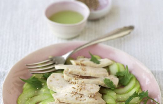 Gurken-Carpaccio mit Ingwerhähnchen & Sesam Zutaten 50 g frischer Ingwer 300 g Hähnchenbrustfilets 1 Salatgurke (ca. 400 g) 4 EL weißer Aceto balsamico (oder Reisessig) Salz 1 TL Zucker 2 TL Wasabipaste (aus der Tube) grüner Pfeffer aus der Mühle 10 g Sesamsamen 1 Bund Koria [...]