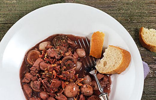 Hähnchen-Pilz-Ragout Zutaten 100 g Bacon (in dünnen Scheiben) 250 g kleine Champignons 700 g Hähnchenbrustfilet 1 EL Butter 1 EL neutrales Öl 1 TL getrockneter Thymian 1 TL Mehl 1/8 l trockener Rotwein 1/8 l Hühner- oder Gemüsebrühe 100 g Perlzwiebeln Salz Pfeffer gu [...]
