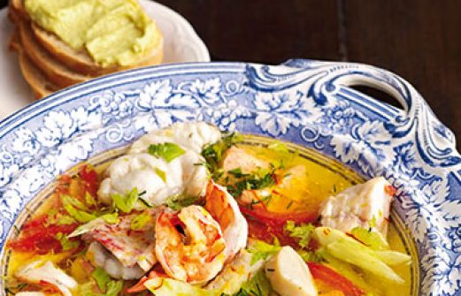 Bouillabaisse mit Safran und Knoblauchbrot Zutaten 1 mehligkochende Kartoffel (130 g) Salz 1 Knoblauchzehe 1 Eigelb (Größe M) 1 TL mittelscharfer Senf 100 ml Olivenöl 1 TL Crème fraîche schwarzer Pfeffer 1 Spritzer Zitronensaft 12 Scheiben Baguette 4 Garnelen ohne Kopf (150 [...]