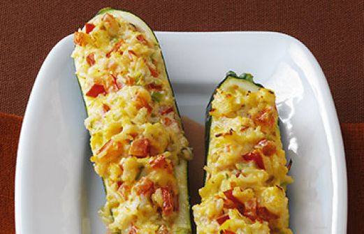 Gefüllte Zucchini Zutaten 150 g parboiled Langkornreis 500 ml Gemüsebrühe 2 Frühlingszwiebeln 2 mittelgroße Zucchini à 300-350 g 1 EL + 2 TL Olivenöl 100 g Tomaten Salz Pfeffer 50 g geriebener Parmesan 50 g Magerquark 1 Eigelb 1 TL getrockneter Oregano 50 g saure Sahn [...]
