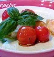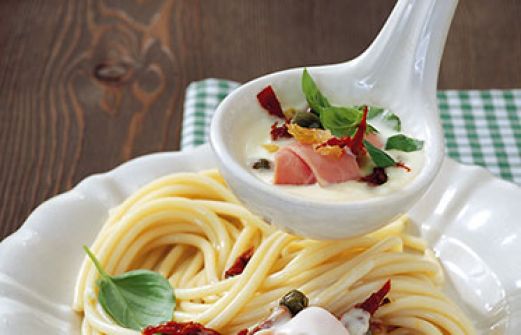 Schinken-Tomaten-Sahne Zutaten 2 Schalotten 10 in Öl eingelegte getrocknete Tomaten 125 g gekochter Schinken ½ Bund Basilikum 2 EL Olivenöl 50 ml Noilly Prat (trockener Wermuth, ersatzweise trockener Weißwein oder Gemüsebrühe) 150 g Sahne 2 EL kleine Kapern Salz Pfeffer 5 [...]