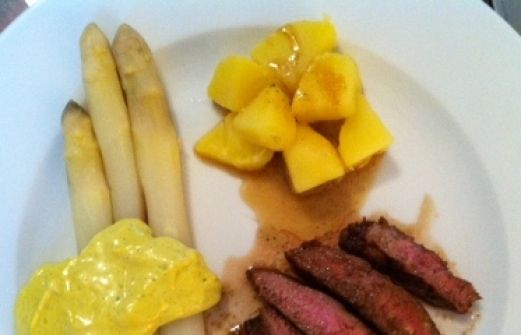 Spargel mit Estragon-Mayonnaise, Wildschweinsteak und Kartoffeln Zutaten 220 ml Rapsöl 1,5 Tl Estragonsenf 1 Ei 1 Knoblauchzehe 1 Tl. Zitronensaft 1-2 große Zweige Estragon 6 Kartoffeln 200-250 g Wildschweinsteak Butter und Öl (Kräuter-)salz und Pfeffer 1 kg Spargel guk:sim [...]