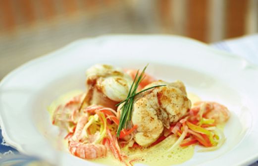 Seeteufel mit Garnelensauce Zutaten 4 Seeteufelkoteletts (à ca. 180 g) Salz Pfeffer 1 kleine, dicke Möhre 1 Stück Knollensellerie (ca. 80 g) 1 Stück Lauch (ca. 60 g) 1 Schalotte 4 EL Butter 400 ml Fischfond (aus dem Glas) 100 ml Weißwein 150 g Sahne 2 Msp. Safranfäden [...]
