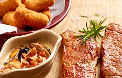 Rumpsteak mit Pilzrahmsauce Zutaten 300 g gemischte Waldpilze (z. B. Pfifferlinge, Maronen, Herbsttrompeten) 4 Scheiben durchwachsener Räucherspeck 4 EL ÖL 4 EL gehackter Rosmarin Salz Pfeffer 200 g Sahne 1 EL scharfer Senf 4 Rumpsteaks (à 200 g; 3-4 cm hoch) guk:similarit [...]