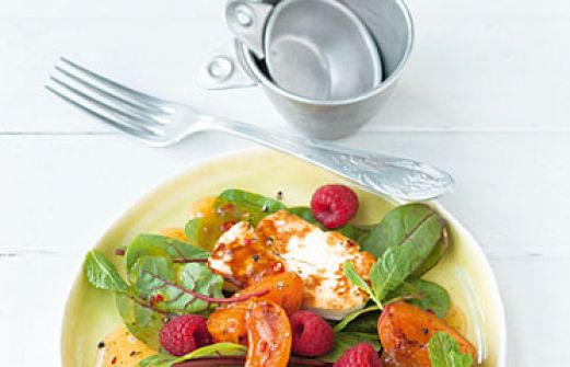 Mangoldsalat mit Aprikosen Zutaten 150 g Halloumi (fester Schafskäse) 100 g rote Mangoldblätter (oder Babyspinat) 200 g reife Aprikosen 100 g Himbeeren 1 rote Chilischote 2 Stiele Minze 1 TL Aprikosenkonfitüre (nach Belieben) 2 EL Reisessig Salz schwarzer Pfeffer aus der M [...]