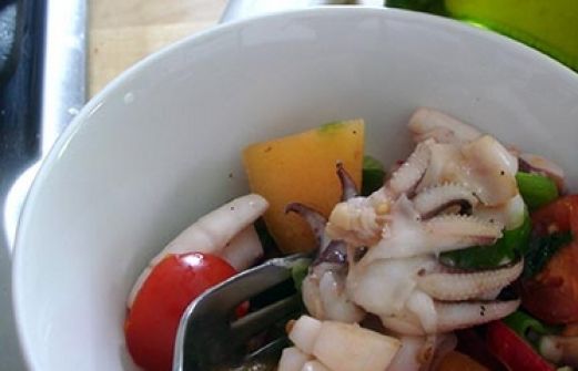 Tintenfisch-Antipasti aus dem Wok Zutaten 500 g mittgelgroße küchenfertige Kalmare oder Sepien (Tintenfische) 1 reife gelbfleischige Melone (Cantaloupe, Charentais) 150 g Kirschtomaten 2 Lauchzwiebeln 4 Zweige Basilikum (am besten roter Thai-Basilikum) 4 Zweige Asia-Minze (keine Pfef [...]