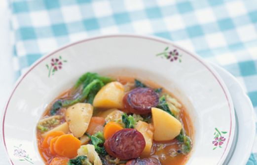 Kohlsuppe mit Chorizo Zutaten 750 g festkochende Kartoffeln 3 Möhren 1 junger Wirsing (ca. 750 g) 3 Zwiebeln 2 Knoblauchzehen 3 EL Olivenöl 2 EL Tomatenmark 100 ml Weißwein (ersatzweise Rinderbrühe) 1,5 l Rinderbrühe 6 Zweige Thymian Salz Pfeffer 200 g Chorizo (am Stüc [...]