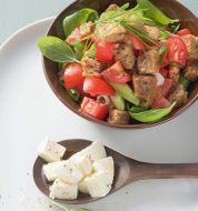 Spargel-Brot-Salat Zutaten 1 TL Senf 1/2 TL Honig 5 EL Gemüsebrühe 1 EL Balsamessig Salz Pfeffer 1/2 TL Olivenöl 200 g gegarter Spargel 2 EL gehacktes Basilikum 4 Kirschtomaten 1/4 Bund Rucola (10-15 g) 1 Knoblauchzehe 1 Scheibe Vollkornbrot 1 TL Parmesan, frisch geri [...]