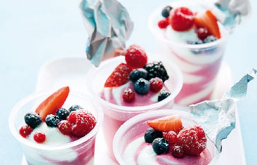 Joghurt-Mousse mit Buntem Beeren-Mix Zutaten 250 g TK-Beeren-Mix 100 g Zucker 4 Blatt Gelatine 500 g Joghurt 2 sehr frische Eiweiß Salz 200 g Sahne 250 g frische gemischte Beeren (z. B. Erdbeeren, Himbeeren, Johannisbeeren, Brombeeren oder/und Heidelbeeren) Puderzucker zum Bestäu [...]