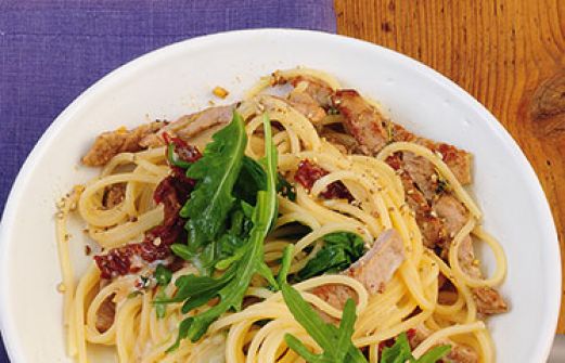Spaghetti mit Kalbfleisch und Rucola Zutaten 200 g Spaghetti Salz 200 g Kalbsschnitzel 50 g Rucola 1 Knoblauchzehe 4 getrocknete Tomaten in Öl 2 EL Öl 2 TL getrockneter Thymian 80 g Sahne Pfeffer guk:similarity-keywords=""> 200 g Spaghetti , Salz , 20 [...]