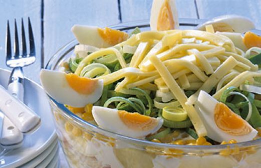 Schichtsalat Zutaten 6 Eier 2 Gläser Selleriesalat in Streifen (à 190 g Abtropfgewicht) 2 kleine Dosen Gemüsemais (à 140 g Abtropfgewicht) 200 g Hartkäse (z. B. Gouda oder Bergkäse) 200 g gekochter Schinken 2 Äpfel 1 Stange Lauch 1 kleine Dose Ananasstückchen (140 g Abtropfgew [...]