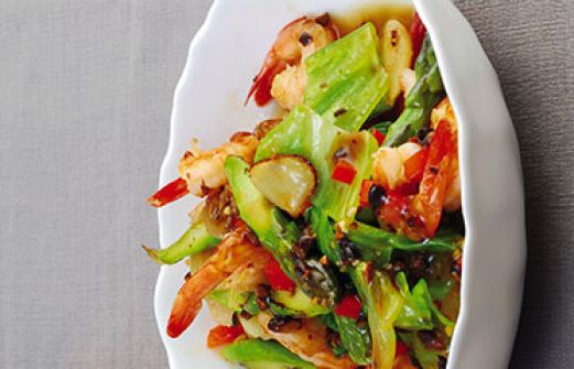 Pfannengerührte Garnelen mit Wasserkastanien Zutaten 500 g küchenfertige, rohe Garnelen 2 Schalotten 1 Knoblauchzehe 1 Stück Ingwer (ca. 1 cm) 1 rote Paprikaschote 8 Stangen grüner Spargel 1 Dose Wasserkastanien (170 g Abtropfgewicht) 4 Blätter Eisbergsalat 1 EL gesalzene sc [...]