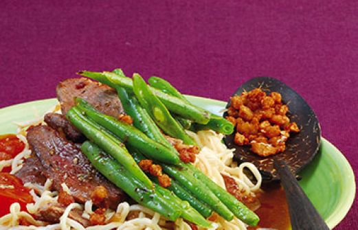 Weizennudeln mit Ente und Bohnen Zutaten 250 g grüne Bohnen Salz 250 g chinesische Weizennudeln 350 g feste Tomaten 1 Zwiebel 1 Knoblauchzehe 2 kleine Entenbrustfilets (à ca. 250 g) Pfeffer 1 EL Öl 150 ml Hühnerbrühe 1 EL Hoisinsauce 1 EL helle Sojasauce guk:similari [...]