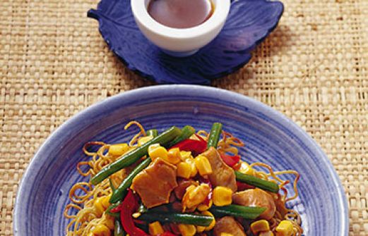 Knuspernudeln mit Hähnchen Zutaten 150 ml Hühnerbrühe 3 EL Hoisinsauce (süß-scharfe Sojasauce; Asienladen) 1 TL Speisestärke 250 g Eier-Mie-Nudeln 200 g grüne Bohnen (ersatzweise TK) 1 rote Paprikaschote 200 g Maiskörner (aus der Dose) 2 Knoblauchzehen 300 g Hähnchenbrustfilet [...]