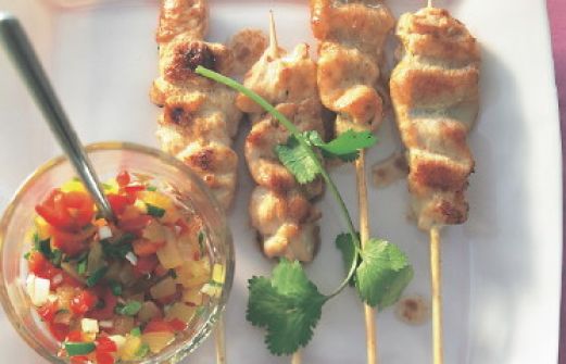 Hähnchenspieße mit Aprikosen-Salsa Zutaten 4 Hähnchenbrustfilets (600 g) 6 EL Teriyakisoße schwarzer Pfeffer (Mühle) 500 g Aprikosen (Dose) 250 g gegrillte, marinierte rote Paprikaschoten (Glas) 1 Lauchzwiebel 1 TL Sambal Oelek Salz 1/2 Bund Koriander 2 EL Öl guk:similarit [...]