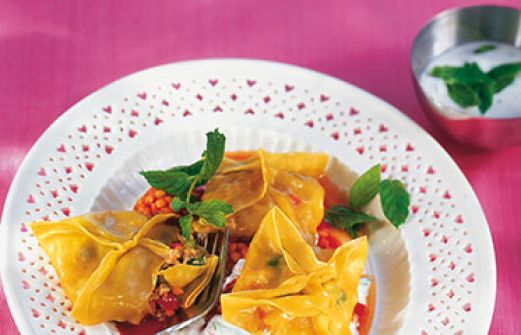 Spinat-Soja-Mantu Zutaten 24 TK-Wan-Tan-Teigblätter (Asienladen) 100 ml Gemüsebrühe (Instant) Salz Chilipulver Pfeffer 50 g feine Sojaschnetzel 1 Zwiebel 1 Knoblauchzehe 1/2 rote Paprikaschote 1 grüne Chilischote 100 g Blattspinat 3 EL Öl 1 EL Zitronensaft 500 ml Gem [...]