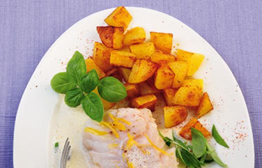 Kabeljau mit Basilikumsahne Zutaten 500 g festkochende Kartoffeln 3 EL Öl 2 EL Butterschmalz 1 Bund Basilikum 1 Schalotte 1 Bio-Zitrone 250 g aufgetautes TK-Kabeljaufilet 50 ml trockener Weißwein (z. B. Riesling; ersatzweise Fischfond) 2 EL Crème fraîche 100 g Sahne 1 TL Ho [...]