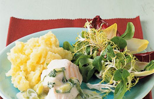 Kabeljau mit Kartoffelpüree Zutaten 1 kg mehligkochende Kartoffeln Salz 200 g Blattsalat 3 EL Aceto balsamico 1 EL Olivenöl 200 ml Geflügelbrühe ! Knoblauchzehe Pfeffer 2 Kabeljaufilets (à 100 g; frisch oder TK und aufgetaut) 1 TL Zitronensaft 2 Bund Frühlingszwiebeln 1 [...]