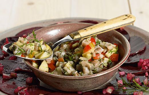 Matjestatar auf Roter Bete Zutaten 1 Rote Bete 2 Schalotten 1-2 EL Zitronensaft 2 TL Zucker Salz Pfeffer 1 EL Rapsöl 3 Matjesheringe 1 säuerlicher Apfel (z. B. Boskop) 1/2 rote Paprikaschote 6 halbe Walnusskerne 1 Bund Dill 1 TL mittelscharfer Senf guk:similarity-ke [...]