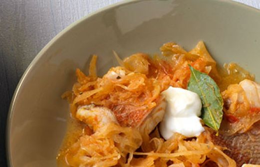 Rotbarsch in Tomaten-Sauerkraut-Gemüse Zutaten 1 mittelgroße Zwiebel 2 Tomaten 2 EL Sonnenblumenöl 200 g Sauerkraut 100 ml Gemüsebrühe 50 ml trockener Weißwein 2 Wacholderbeeren 1 Lorbeerblatt schwarzer Pfeffer 1/2 TL edelsüßes Paprikapulver 3 Stängel glatte Petersilie 350 [...]
