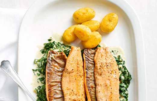 Saibling mit Zwiefe-Wurzelspinat Zutaten 1,2 kg Wurzelspinat 1 große Gemüsezwiebel 1 große Knoblauchzehe 3 EL kalte Butter 200 g Sahne Salz schwarzer Pfeffer aus der Mühle frisch geriebene Muskatnuss 8 Saiblingsfilets (mit Haut, je ca. 100 g) Salz schwarzer Pfeffer aus d [...]