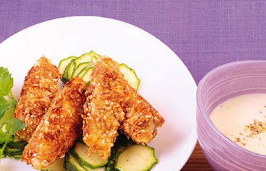 Seelachs-Sticks mit Meerrettich-Dip Zutaten 1 Zucchino (ca. 250 g) 5 Blätter frische Minze (ersatzweise Basilikum) 2 EL Apfelessig 1 EL Rapsöl 2 TL Zucker Salz Pfeffer 80 g Joghurt 1 EL leichte Salatmayonnaise 1 EL Sahnemeerrettich (aus dem Glas) 2 EL frisch gepresster Zitro [...]