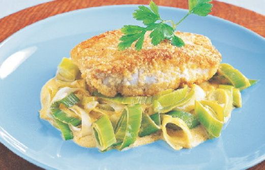 Seelachs mit Mandeln und Lauch Zutaten 1 kg Lauch 30 g Butter Salz Pfeffer 200 ml Brühe 600 g Seelachsfilet je 3 EL Paniermehl und gemahlene Mandeln 2 EL Mehl 1 Ei 30 g Butterschmalz 1 Becher Crème fraîche (125 g) 1 EL mittelscharfer Senf guk:similarity-keywords=""> [...]