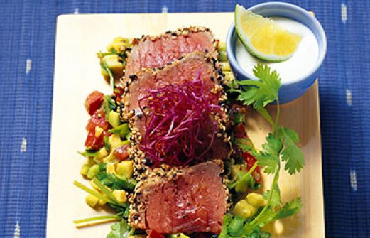 Thunfisch »schwarzweiß« mit Avocado und Sprossen Zutaten 400 g Thunfisch am Stück (Sushi-Qualität) 1 EL Olivenöl 1 reife Avocado (320 g) Saft von ½ Limette 1 Tomate (100 g) 1 Frühlingszwiebel (20 g) 2 Zweige Koriandergrün 2 EL Olivenöl Meersalz (z.B. Fleur de Sel) frisch gema [...]