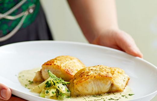 Gebratener Waller mit dreierlei Senf Zutaten 700 g Wallerfilet (ohne Haut) 1 Stück Lauch (weißer Teil, ca. 80 g) 3 Champignons 1/2 Zitrone 1 EL Sauerbratengewürz 2 EL Butter 2 EL Mehl 100 ml trockener Weißwein 400 ml Fischfond (aus dem Glas) 200 g Sahne Salz schwarzer Pf [...]