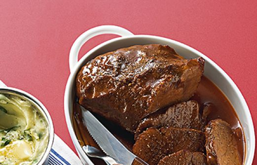 Rinderschmorbraten Zutaten 800 g Rinderschmorbraten (aus der Keule, ohne Knochen) Salz, schwarzer Pfeffer 1 Bund Suppengrün 3 Zwiebeln 3 EL Pflanzenöl 1/2 EL Zucker 1 EL Tomatenmark 400 ml Rinderbrühe 1-2 EL dunkler Saucenbinder guk:similarity-keywords=""> 800 g Rindersch [...]