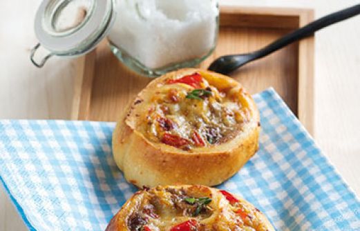 Hackfleisch-Schnecken Zutaten 400 g Pizzateig (37 x 25 cm; Fertigprodukt; Kühlregal) 1 Zwiebel 1 rote Paprikaschote 2 EL Olivenöl Salz Pfeffer 1 TL getrockneter Thymian 100 g Bergkäse 1 Ei (Größe M) 1 TL scharfer Ajvar (Glas) 250 g gemischtes Hackfleisch 1 TL edelsüßes Pa [...]