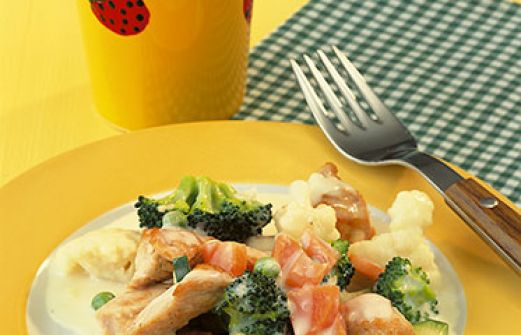 Putengeschnetzeltes in Gemüserahmsauce Zutaten 2,2 kg Putenbrust 3 Zwiebeln 2 kg gemischtes Gemüse (z. B. Möhren, Brokkoli, Blumenkohl, Zucchini) Salz Pfeffer 1 l Sahne 1,5 l Gemüsebrühe geriebene Muskatnuss 1-3 EL Speisestärke 200 g TK-Erbsen Öl zum Braten guk:similar [...]