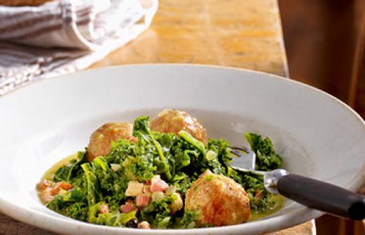 Grünkohl mit Speck und Mettklößchen Zutaten 1,2 kg Grünkohl 1 mehligkochende Kartoffel 2 große Zwiebeln durchwachsener Räucherspeck 1 1/2 Schweine- oder Butterschmalz 3/4 l Rinder- oder Gemüsebrühe 1/2 TL Pimentkörner Salz Pfeffer 1 EL scharfer Senf 1 große Zwiebel 1 Kno [...]