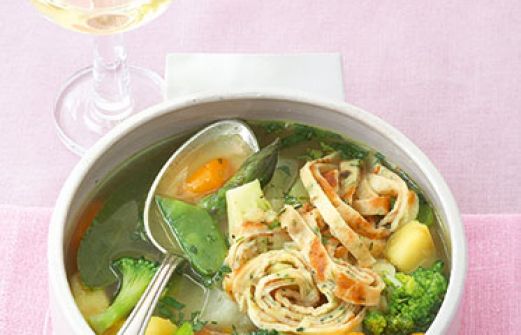 Gemüseeintopf mit Kräuterflädle Zutaten 2- 3 EL Butter 75 g Mehl 1/8 l Milch 1 Ei (Größe M) Salz 1 Bund Frühlingskräuter (z. B. Schnittlauch, glatte Petersilie, Kerbel, Estragon) 800 g Frühlingsgemüse (z. B. Möhren, Kohlrabi, Brokkoli, Mairübchen, grüner Spargel, Zuckerschoten) [...]