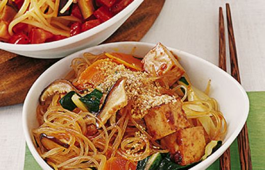 Glasnudelpfanne mit Tofu Zutaten 50 g getrocknete Shiitakepilze 50 g Glasnudeln 20 g frischer Ingwer 4-6 EL Sojasauce 2-3 EL Chilisauce 2 EL Limettensaft 400 g Tofu 250 g Möhren 250 g Pak Choi (ersatzweise Mangold oder Lauch) 2 EL Rapsöl 1-2 EL Gomasio (Sesamsalz, Reformh [...]
