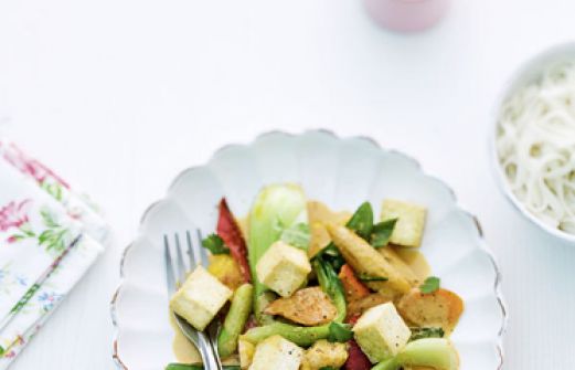 Gemüsecurry mit Tofu Zutaten 150 g Zuckerschoten 4 Frühlingszwiebeln 150 g Hokkaido-Kübrbis 1 Pak Choi (oder 150 g Mangold) je 1 rote und gelbe Paprikaschote 8 frische Mini-Maiskolben 2 Möhren 1 Knobauchzehe 25 g frischer Ingwer 2 EL Sesamöl 2 TL rote Currypaste (Asienla [...]
