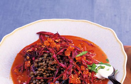 Curry-Linsen-Rotkohl mit Ingwer-Raïta Zutaten 200 g Puy-Linsen 450 g Rotkohl 100 g getr. Aprikosen 3 EL Öl 1 EL Koriandersamen 1 TL Bockshornkleesamen 1 EL Zucker 2 EL Fisch-Curry-Masala-Pulver (oder normales Currypulver) 300 ml Gemüsebrühe 200 ml Kokosmilch (Dose) 3-4 EL Z [...]