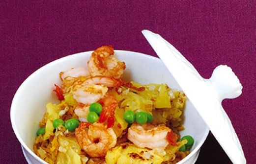 Curry-Bratreis mit Ananas Zutaten 400 g frische Ananas 150 g tiefgekühlte Erbsen 2 Zwiebeln 2 Knoblauchzehen 1 Stück Ingwer (ca. 2 cm) 250 g geschälte, gegarte Garnelen 3 EL Butterschmalz 3 TL Currypulver 1 TL Kurkuma 750 g kalter, gekochter Basmatireis (aus 400 g Reis, er [...]