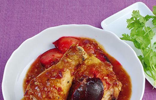 Hähnchenkeulen in Pflaumensauce Zutaten 5 Hähnchenkeulen (ca. 1,2 kg) Salz Pfeffer 1 rote Zwiebel 2 Knoblauchzehen 1 Stück Ingwer (ca. 4 cm) 2 kleine rote Chilischoten 400 g Pflaumen (ersatzweise Zwetschgen) 4 EL Öl 150 ml Pflaumenwein (Asienregal) 125 ml Hühnerfond (aus [...]