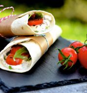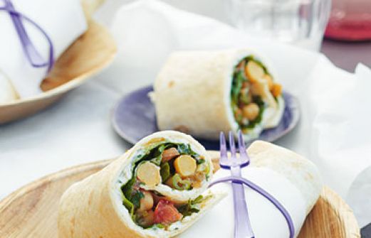 Wraps mit Kichererbsen, Tomaten und Schafskäse Zutaten 1 Dose Kichererbsen (ca. 240 g Abtropfgewicht) 1 Knoblauchzehe 3 Frühlingszwiebeln 1/2 Bund Petersilie 2 Fleischtomaten 2 EL Olivenöl Saft und abgeriebene Schale von ½ Bio-Zitrone Salz Pfeffer 1 Römersalat 200 g Scha [...]