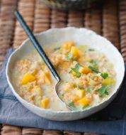 Rote Linsensuppe mit Curry Zutaten 2 Möhren 1 Stück Lauch (ca. 120 g) 1 säuerlicher Apfel (z. B. Boskop) 1 große Zwiebel 2 EL Butterschmalz 200 g rote Linsen 1,2 l Gemüse- oder Hühnerbrühe 1 EL Currypulver Salz Pfeffer 2 TL frisch gepresster Zitronensaft 150 g Sahnejogh [...]