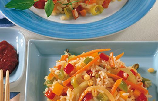 Gebratener Reis mit Gemüse und Ei Zutaten Je 1 rote, grüne und gelbe Paprikaschote 1 dicke Möhre 1 Stück Salatgurke (etwa 200 g) 150 g Sojabohnensprossen 2 Zwiebeln 2 Knoblauchzehen 6 EL Öl 600 g gekochter Langkornreis vom Vortag (ungekocht 200 g) 4 EL Sojasauce Salz etwas S [...]