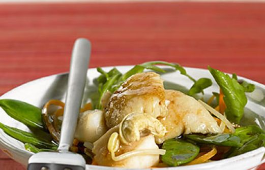 Bunter Salat mit Rotbarsch Zutaten 2 Möhren 100 g Rucola 100 g Zuckerschoten 100 g Sojabohnensprossen 400 g Rotbarschfilet 1 Zitrone 4 EL Sojasauce 1 EL Fischsauce Salz 1 walnussgroßes Stück Ingwer 1 Knoblauchzehe 5 EL Öl etwas Sesamöl 1-2 EL Honig 12 Cashewkerne [...]