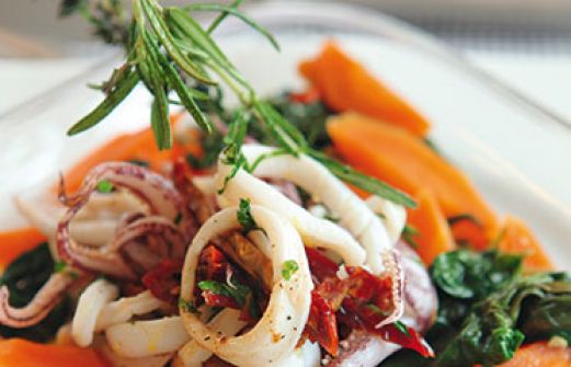 Gebratener Tintenfisch auf Ingwer-Möhren Spinat Zutaten 200 g marinierte Möhren 50 ml Geflügelbrühe 1 Chilischote 3 Scheiben Ingwer 2 TL Butter 1 TL Honig 1 Bio-Zitrone 1 Schalotte 200 g Spinat 30 g gerösteter Sesam Salz Pfeffer Zucker 400 g Tintenfisch (Tuben, küch [...]